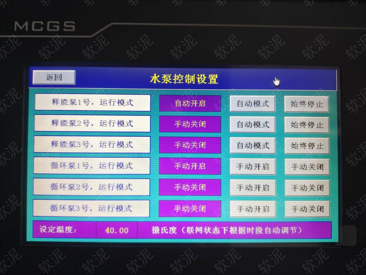 | 1. 項(xiàng)目位于承德市承德縣高寺臺鎮(zhèn)高寺臺村鑫澤花園小區(qū),冬季供暖系統(tǒng),夜間谷電價(jià)期間給大水箱蓄熱,二次網(wǎng)循環(huán)泵始終運(yùn)行,一次網(wǎng)循環(huán)泵通過間歇運(yùn)行,給板式換熱器升溫,維持二次網(wǎng)恒定溫度。白天不蓄熱,只釋放存儲的熱能,節(jié)約電費(fèi)。 2. 現(xiàn)場沒有人值班,通過手機(jī)軟件隨時(shí)可查傳感器數(shù)據(jù)。不限管理人員人數(shù),每人實(shí)名賬戶,自動保存操作記錄。 3. 設(shè)備可選擇自動模式,根據(jù)設(shè)定參數(shù)自動啟停。也可選擇手動模式,直接啟停每個(gè)設(shè)備用于調(diào)試檢修。 4. 配電柜數(shù)量較多,增加了聯(lián)動信號,只需操作總開關(guān)即可直接啟停所有設(shè)備。 |